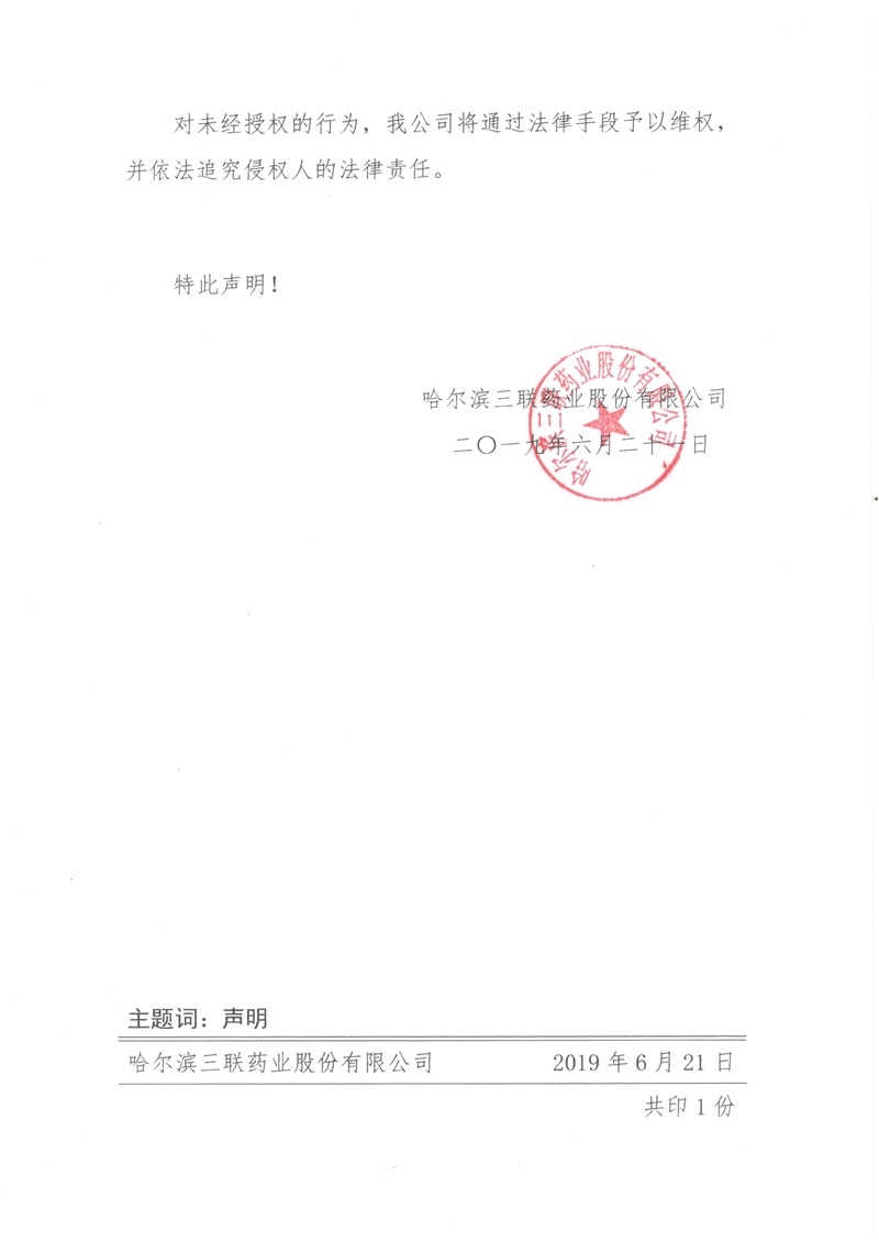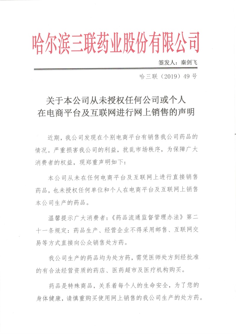 企業動態 企業動態 行業動態新聞中心企業動態關于本公司從未授權任何公司或個人在電商平臺及互聯網進行網上銷售的聲明發布日期:2019-06-24 點擊次數: 次 近期,我公司發現在個別電商平臺有銷售我公司藥品的情況。嚴重損害我公司的利益,擾亂市場秩序,為保障廣大消費者的權益,現鄭重聲明: 上一篇文章下一篇文章