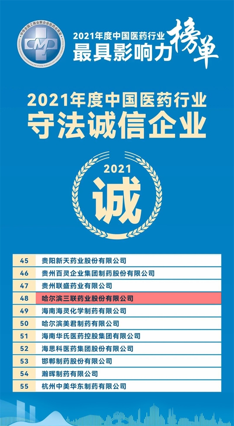 哈三聯喜獲2021年度中國醫藥行業守法誠信企業
