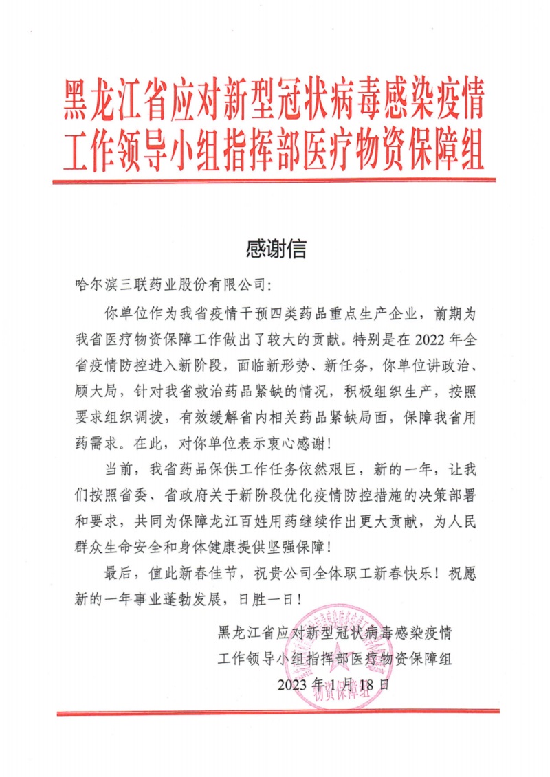 企業動態 企業動態 行業動態新聞中心企業動態省指揮部醫療物資保障組向我公司發來感謝信發布日期:2023-01-19 點擊次數: 次 1月19日,黑龍江省應對新型冠狀病毒感染疫情工作領導小組指揮部醫療物資保障組向我公司發來感謝信,對我公司積極組織生產、有效緩解省內相關藥品緊缺局面、保障我省用藥需求表示感謝。 上一篇文章下一篇文章