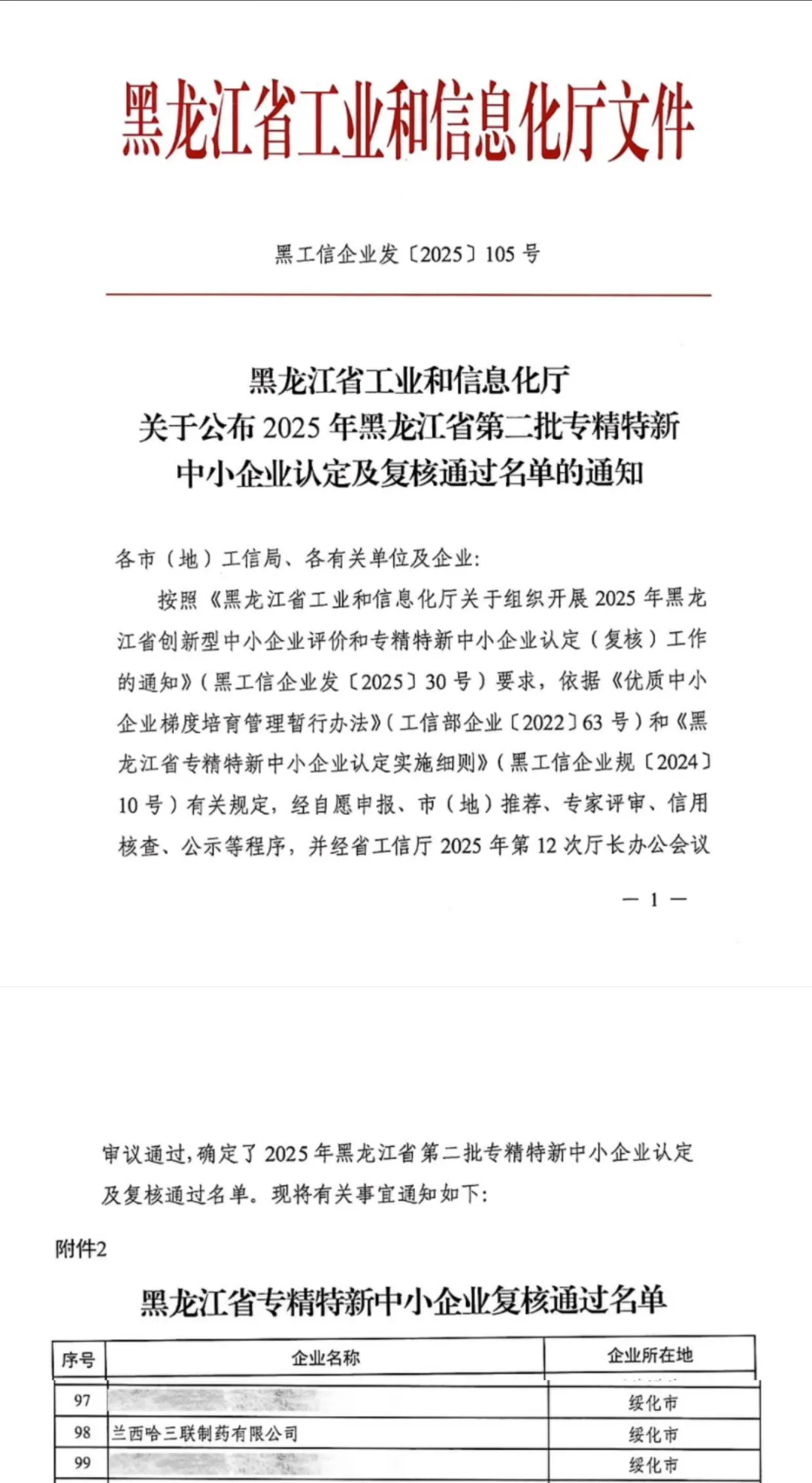 7月17日,黑龍江省工業和信息化廳公布了2025年第二批“專精特新”中小企業認定及復核通過名單,哈三聯全資子公司蘭西哈三聯制藥順利通過復核,再次被認定為黑龍江省“專精特新”中小企業。