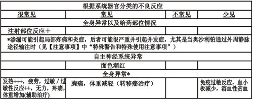 奧沙利鉑與5-氟尿嘧啶/亞葉酸聯合使用期間,可觀察到的最常見的不良反應為:胃腸道(腹瀉,惡心,嘔吐以及黏膜炎)、血液系統(中性粒細胞減少,血小板減少)以及神經系統反應(急性,劑量累積性,外周感覺神經病變)。總體上,這些不良反應在奧沙利鉑與5-氟尿嘧啶/亞葉酸聯合使用時比單獨使用5-氟尿嘧啶/亞葉酸時更常見、更嚴重。下列表格中顯示的不良反應發生率數據來自國外轉移癌治療和輔助治療所進行的臨床研究(奧沙利鉑與5-氟尿嘧啶/亞葉酸聯合治療組分別包括416和1108例患者),以及來自上市后經驗。